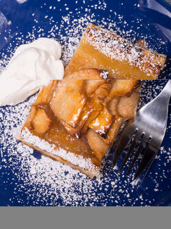まぶしたアプリコット釉パイ生地で焼きリンゴのタルトの部分は粉砂糖と新鮮なホイップ クリームを添えています の写真素材 画像素材 Image